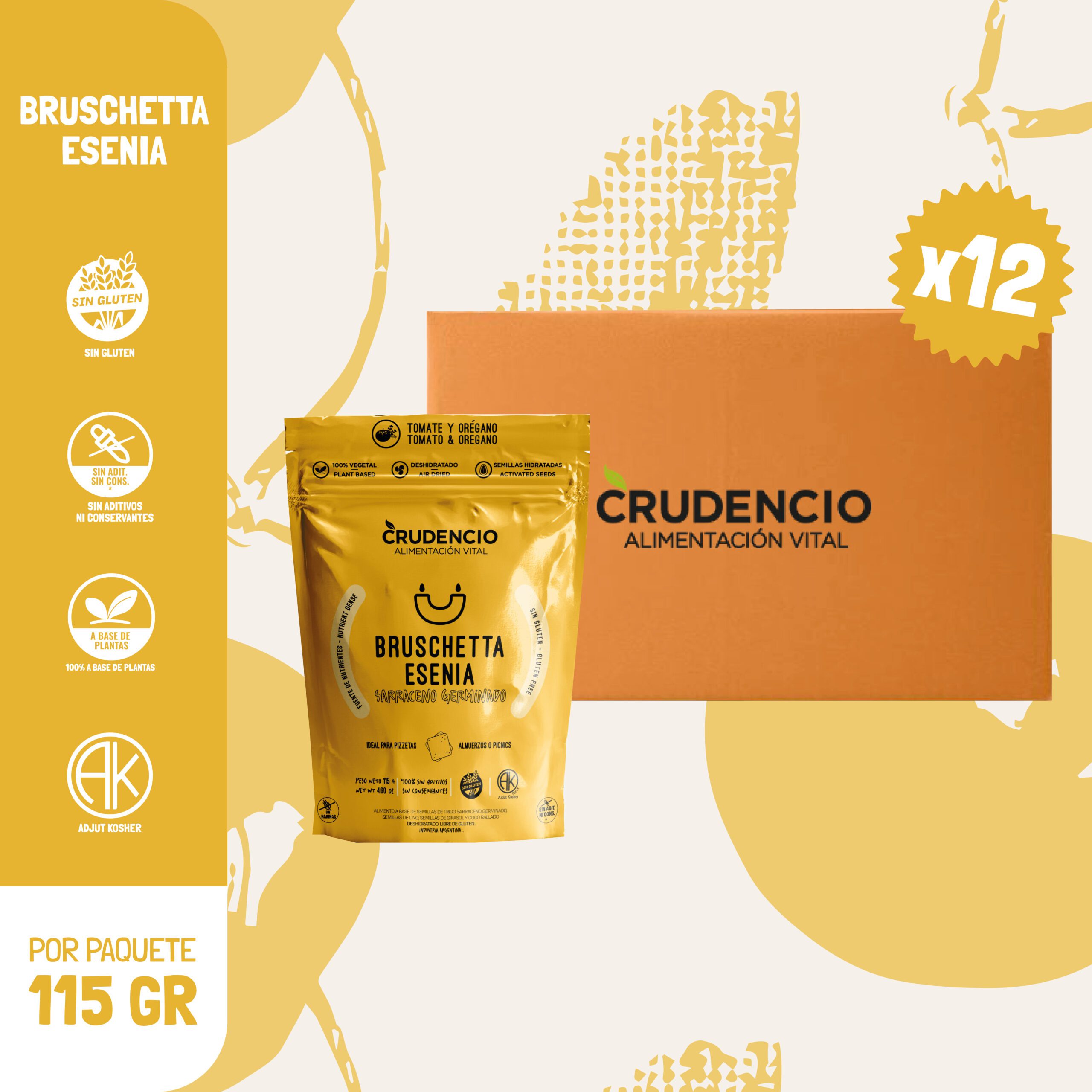 La Bruschetta Esenia está elaborada a base de trigo sarraceno germinado, como el pan esenio, y lleva una salsa natural de tomate y orégano sin cocción, luego deshidratada para conservar todo su sabor y propiedades.