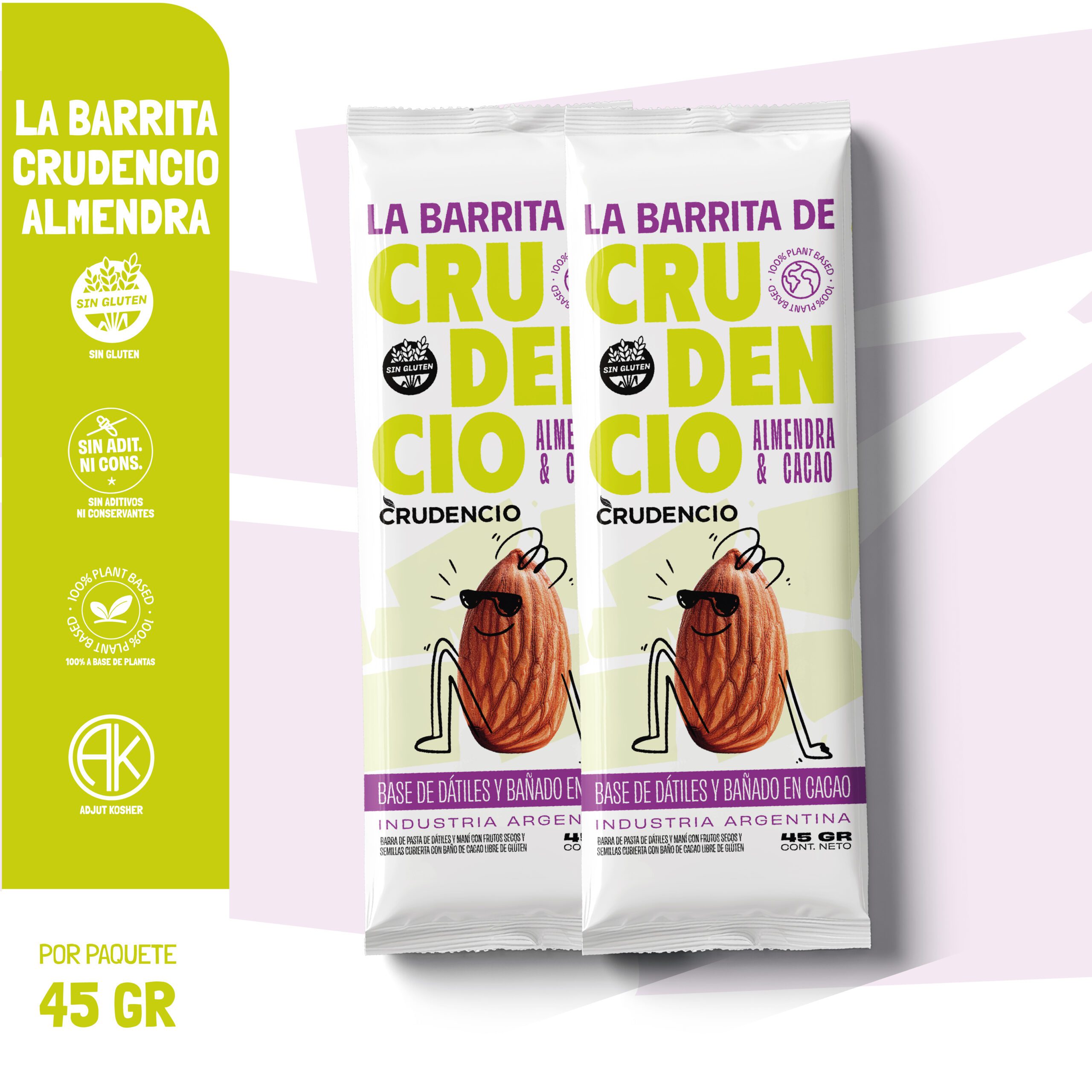 Barrita Almendras: Dátiles, almendras, chia, quinoa flakes, pasta de maní, harina de coco; baño de cacao ( cacao, manteca de cacao y azúcar de coco)