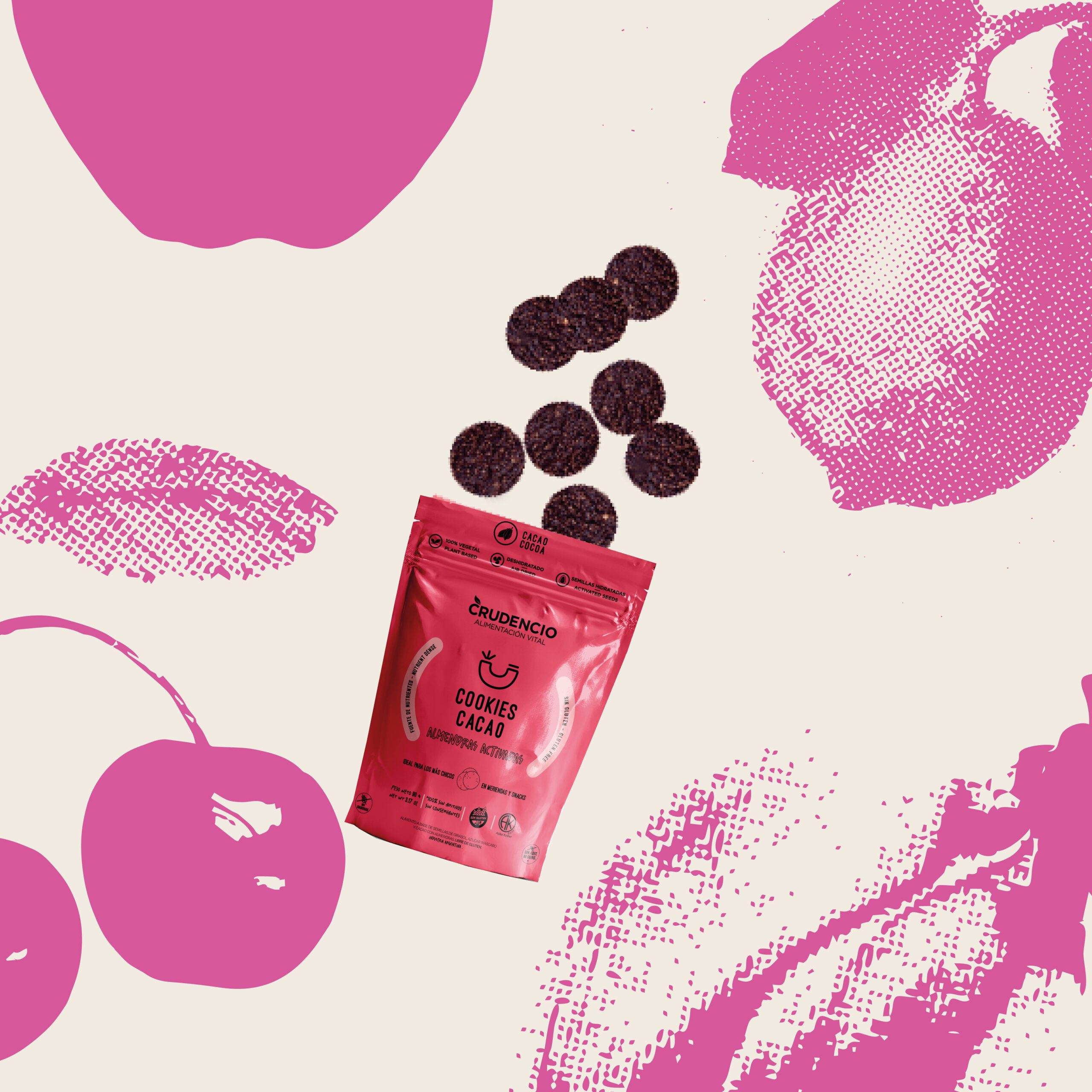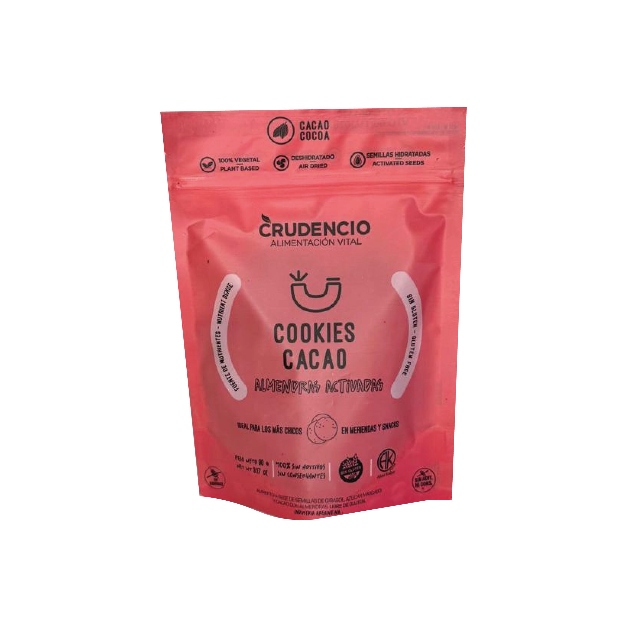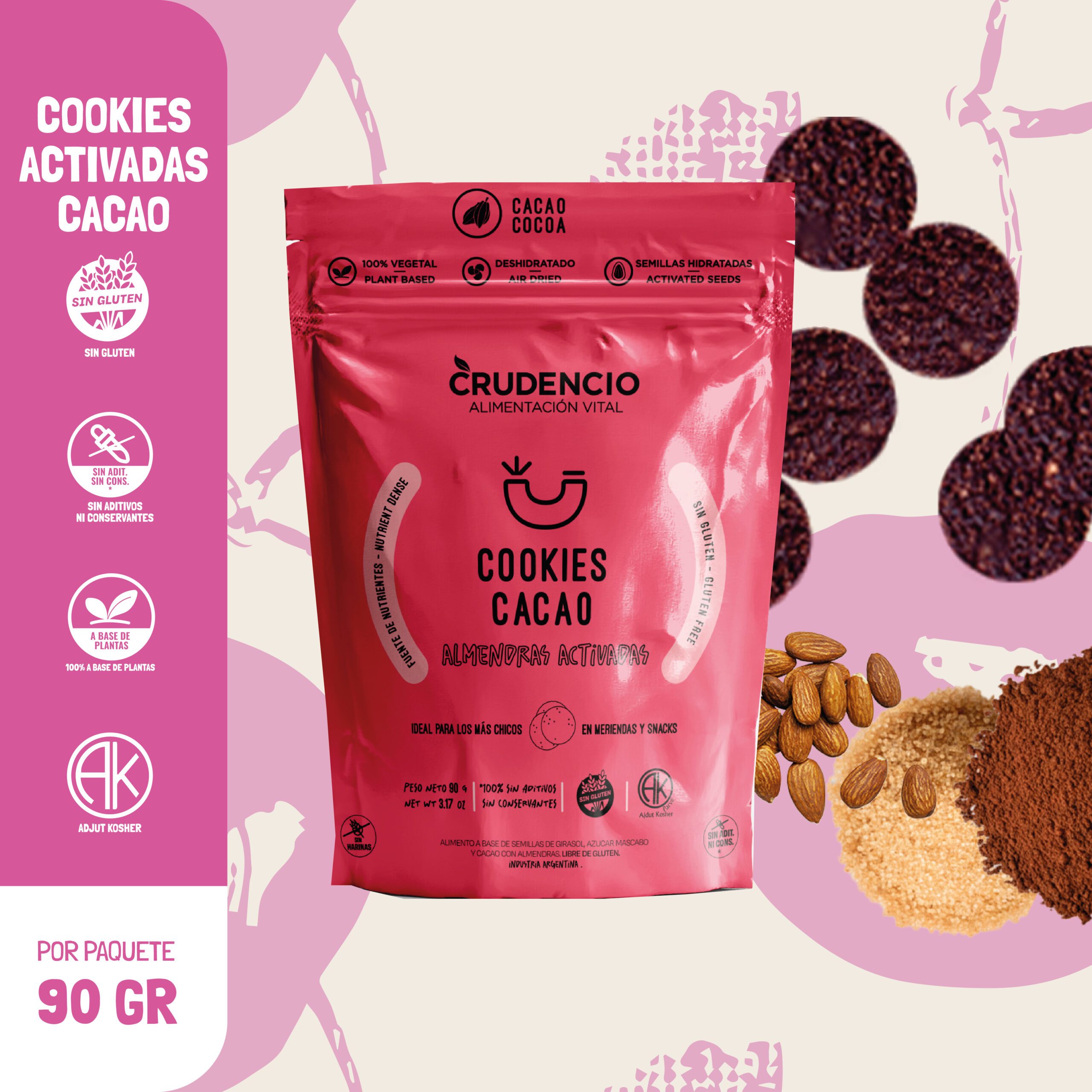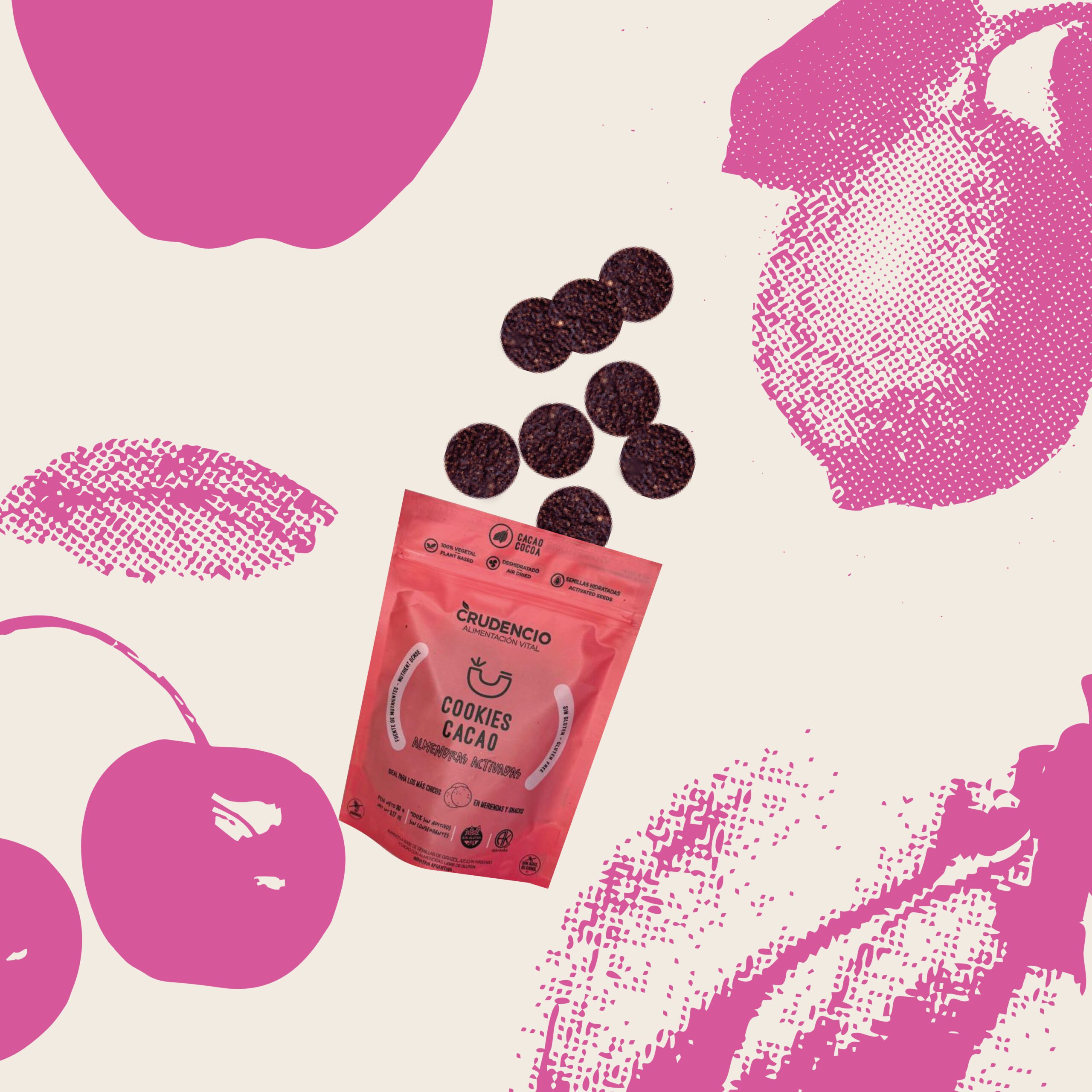 Cookies dulces de puro cacao, hechas a base de almendras activadas y semillas de girasol activadas, endulzadas suavemente con azúcar mascabo.