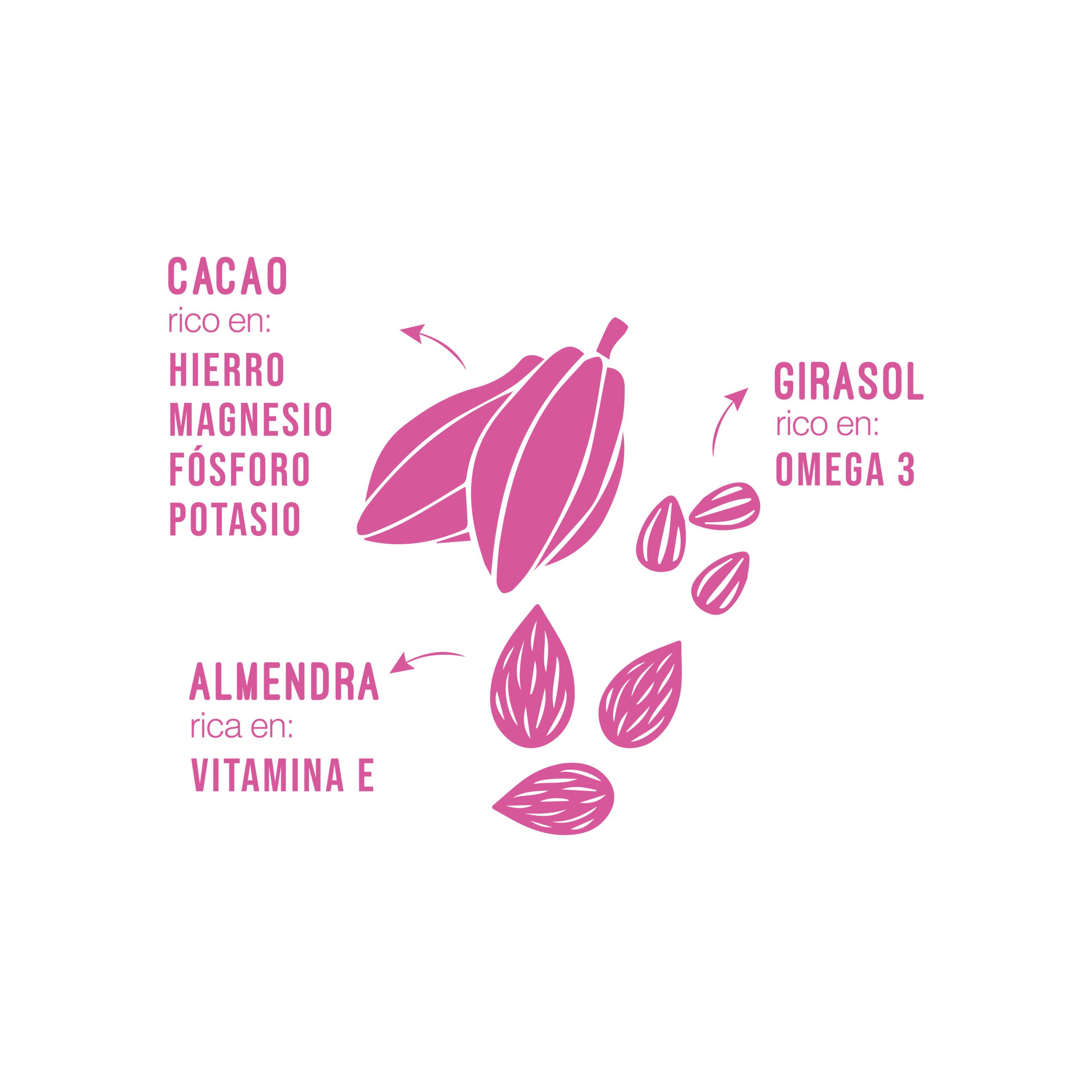 Semillas de girasol, azúcar mascabo, almendras, cacao en polvo, pasas de uva, dátiles.