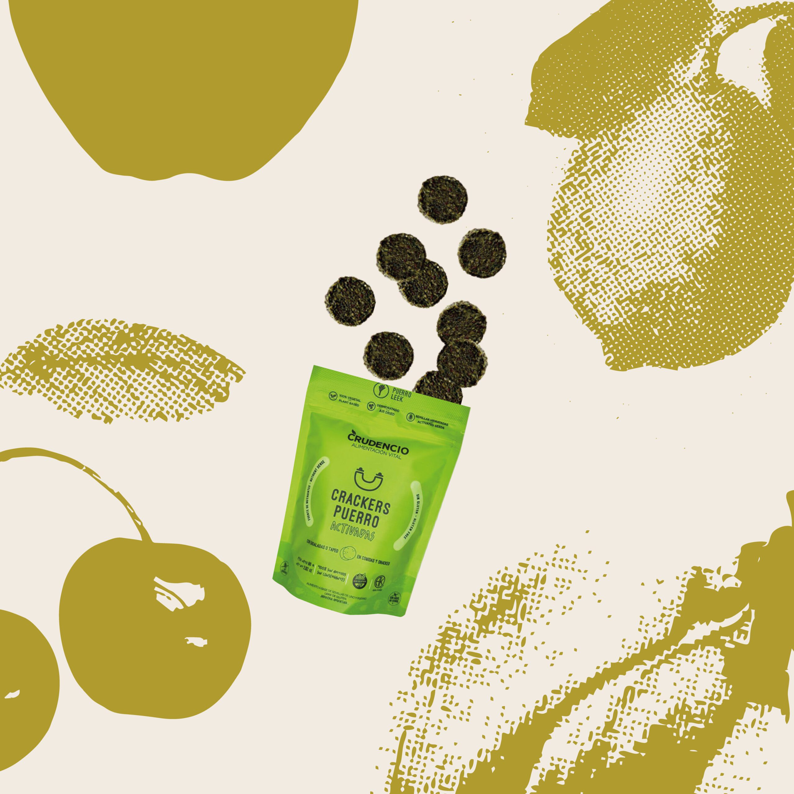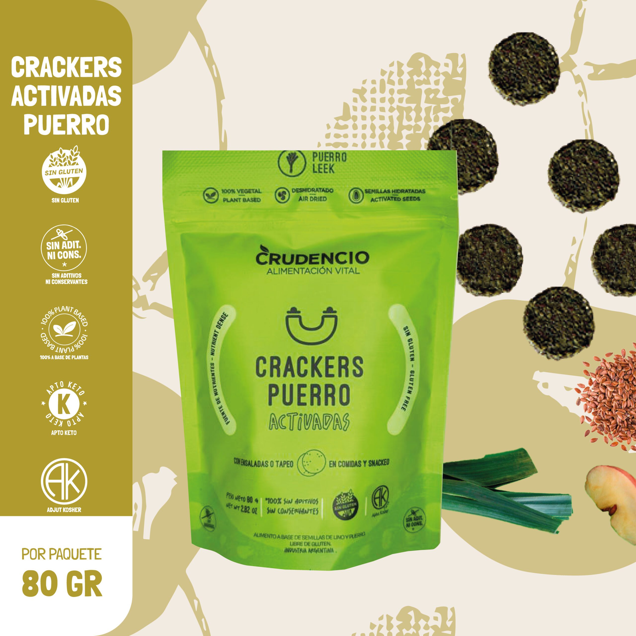 Estas crackers saladas de puerro están hechas a base de semillas de lino y girasol, combinando sabor vegetal intenso con una textura crocante y natural.