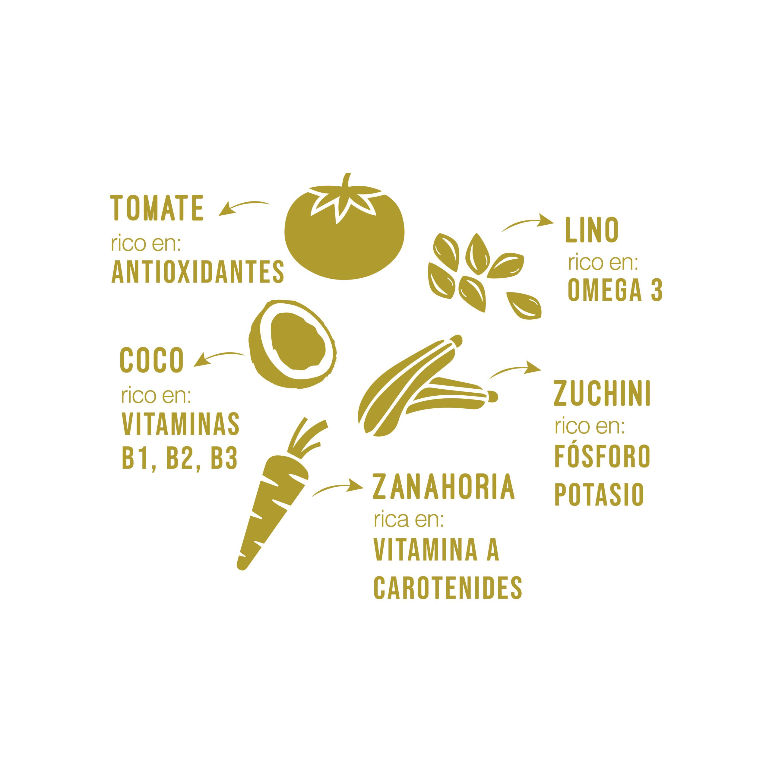 Semillas de lino dorado orgánico, coco rallado, zucchini, zanahoria, tomate deshidratado, agua, aceite girasol alto oleico, sal marina.