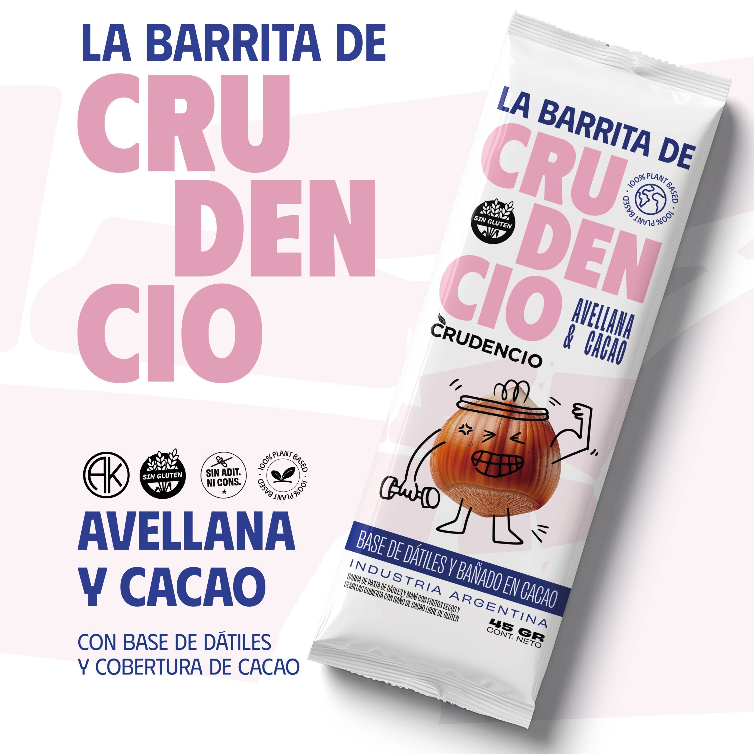 Barrita Avellanas: Dátiles, avellanas, chia, quinoa flakes, pasta de maní, harina de coco; baño de cacao ( cacao, manteca de cacao y azúcar de coco)