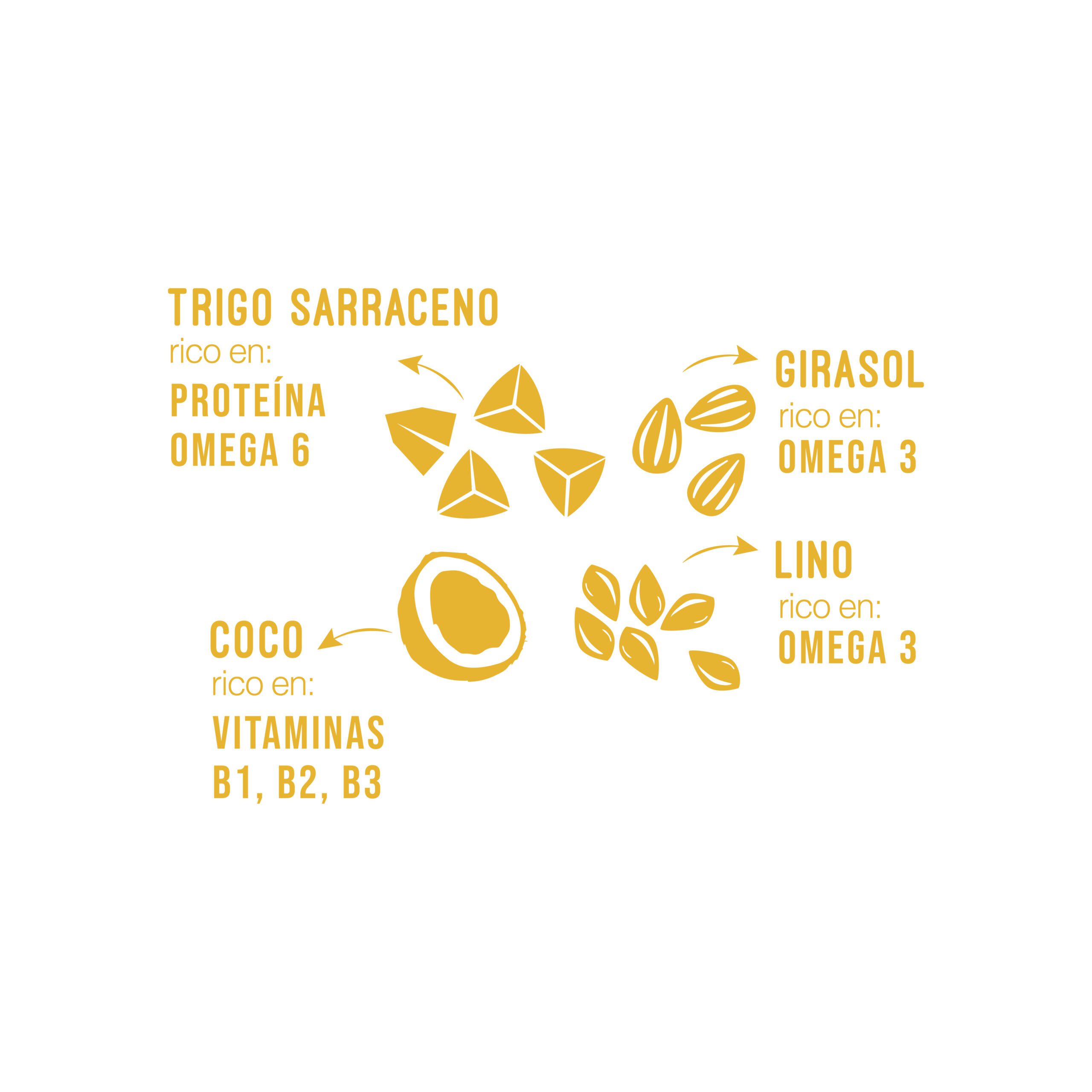 Trigo Sarraceno agroecologico, Girasol, Lino dorado orgánico, Coco, aceite de girasol alto oleico, sal marina, y especias.